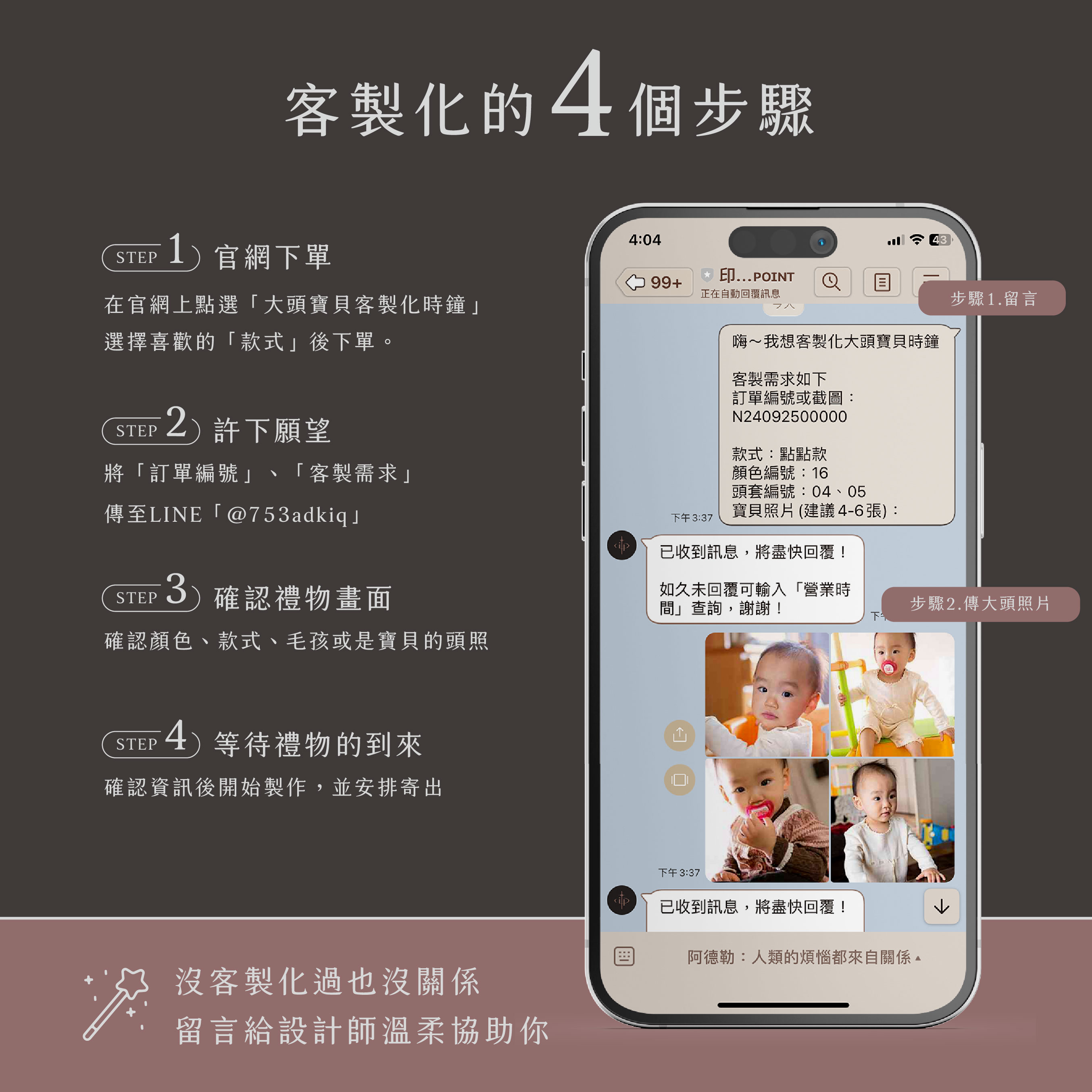 客製流程: ꜱᴛᴇᴘ1 選擇喜歡「款式」結帳下單。 ꜱᴛᴇᴘ2 至LINE「@753adkiq」提供「訂單編號、時鐘款式、底色、照片(3-4張)」。 ꜱᴛᴇᴘ3 等待設計師提供校稿圖面確認。 ꜱᴛᴇᴘ4 完成,等待收禮物 .ᐟ