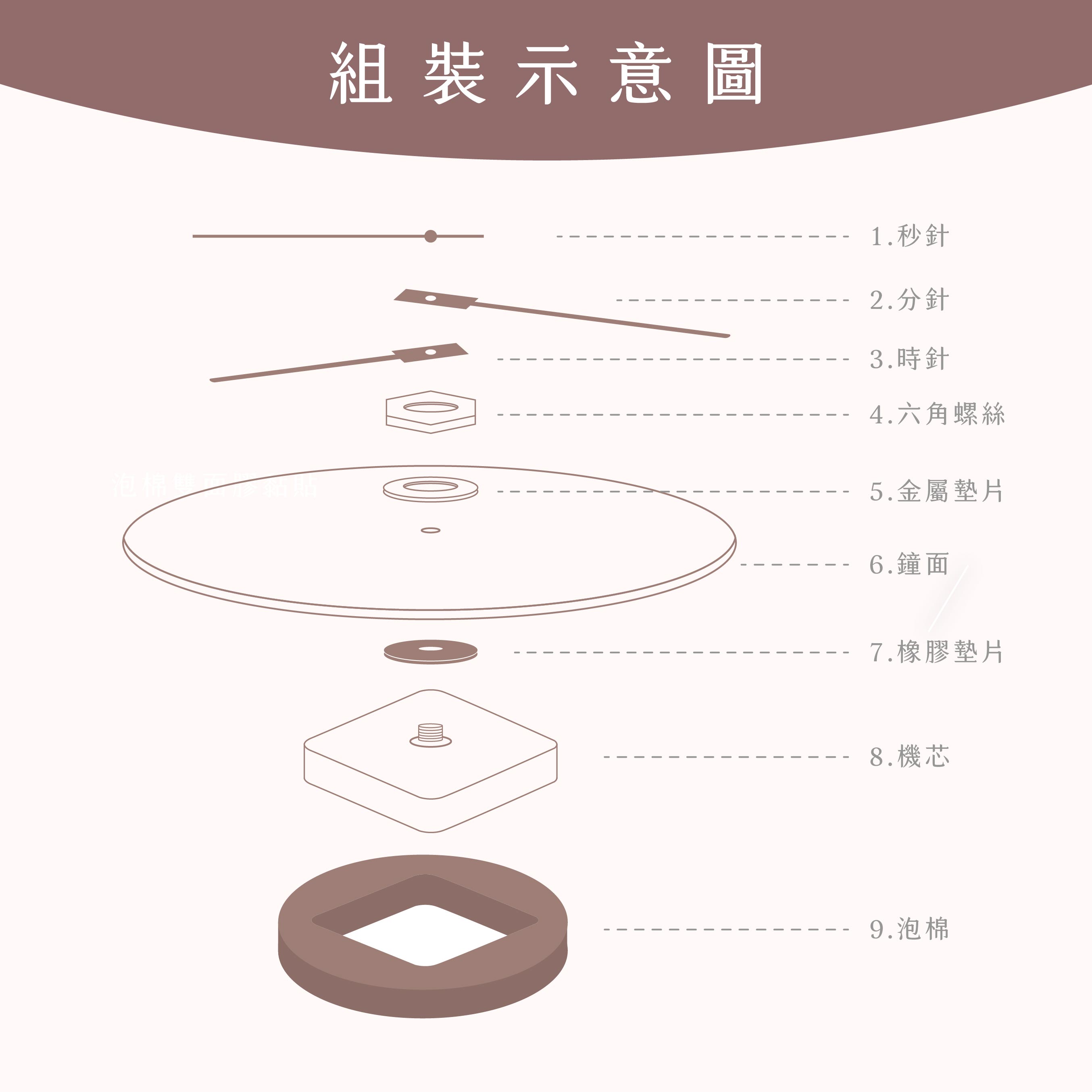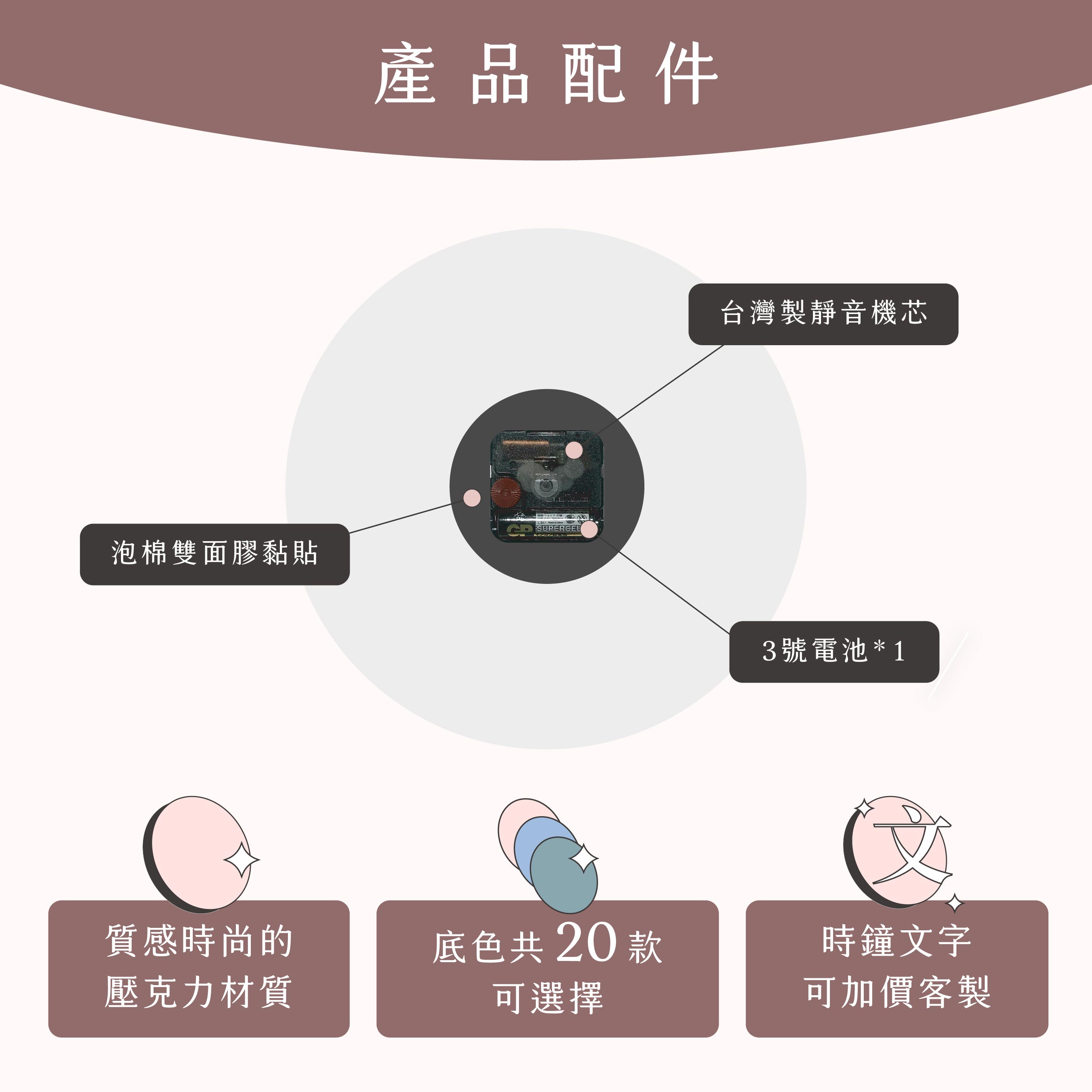 材料3mm壓克力圓板 / 時針 / 分針 / 秒針 / 時鐘機芯 / 螺絲五金 / 黑泡棉貼